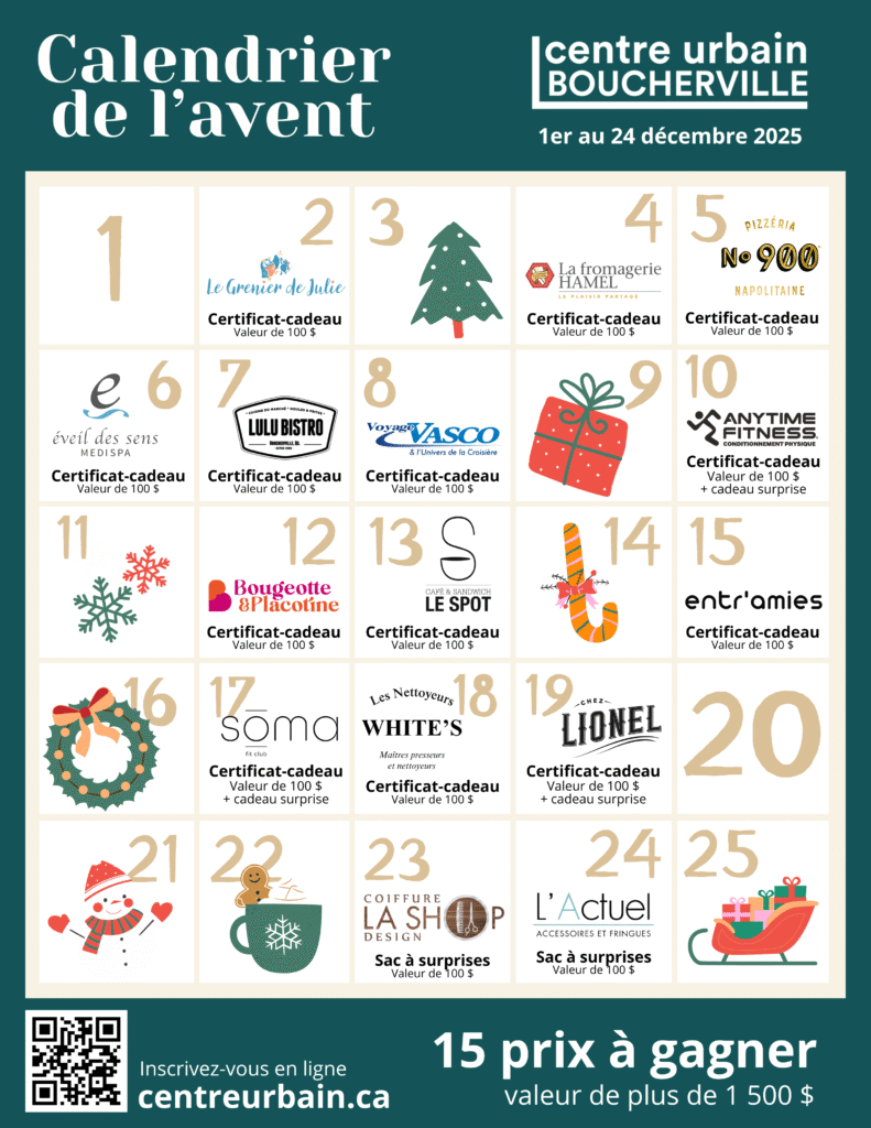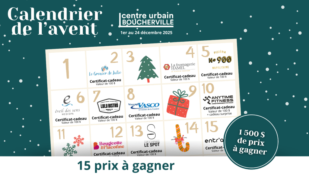 Le temps des Fêtes approche, et au Centre urbain Boucherville, on aime célébrer en grand avec nos commerçants. Cette année, quinze d’entre eux se joignent à nous pour offrir un concours festif qui fait du bien.